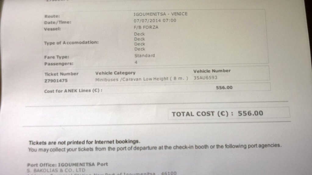 Geçenlerde İnternette http://ferries-booking.com/ sitesinde Igoumenitsa-Venedik gidiş dönüş araba ve ailem için deck olarak 1152 Euro bedelle yer buldum. Ama İstanbul Yetkili satış ofisinin bulamadığı yeri bu sitede olması biraz bende çekimserlik yarattı.