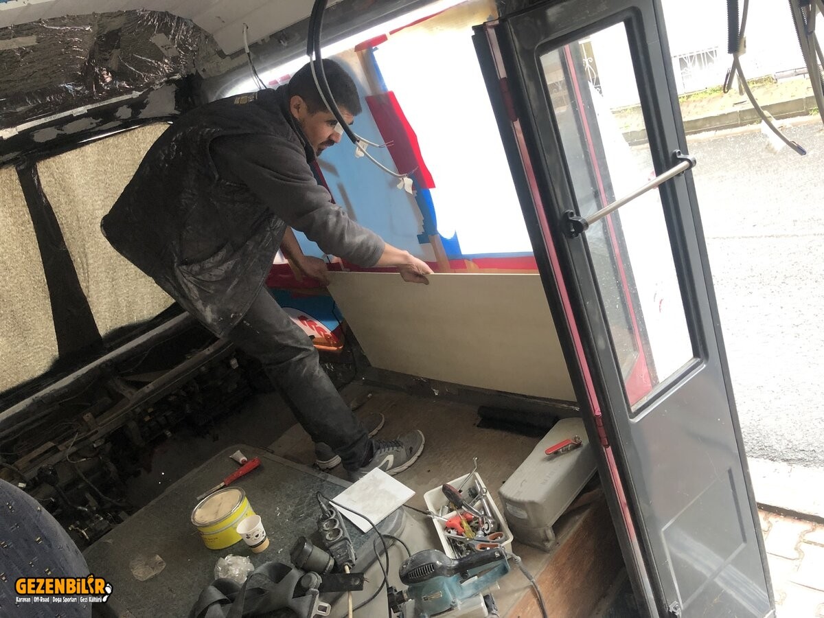 Aracın iç yan duvarlarının kaplamasına geçtik. 4mm kavak kontrayla kaplama yapıp, birleşme yerlerini de aracın cam çıtalarının hizasına denk getirip oralara T alüminyum taktık. Gayet şık oldu. Kontraları takmadan önce zımpara yapmıştık. Taktıktan sonra da astar ve 2 kat boya attık. Sonra ince bir zımpara yapıp 2 kat daha boya attık. Sonuç mükemmel oldu...