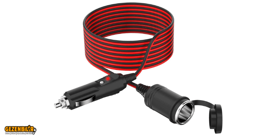 Solar şarj regülatöründen yaşam aküsüne giden kabloları keserek araya yukardaki kabloda görüldüğü gibi bir fiş ve bir priz bağlamak lazım. Yaşam aküsü şarj olurken bu fiş prize takılı olur. Araç aküsünü şarj etmek isteyince bu fişi uzatma kablosunun prizine, uzatma kablosunun fişini de çakmaklığa takarsınız. Araç boş dururken araç aküsünü böylece dolu tutabilirsiniz.