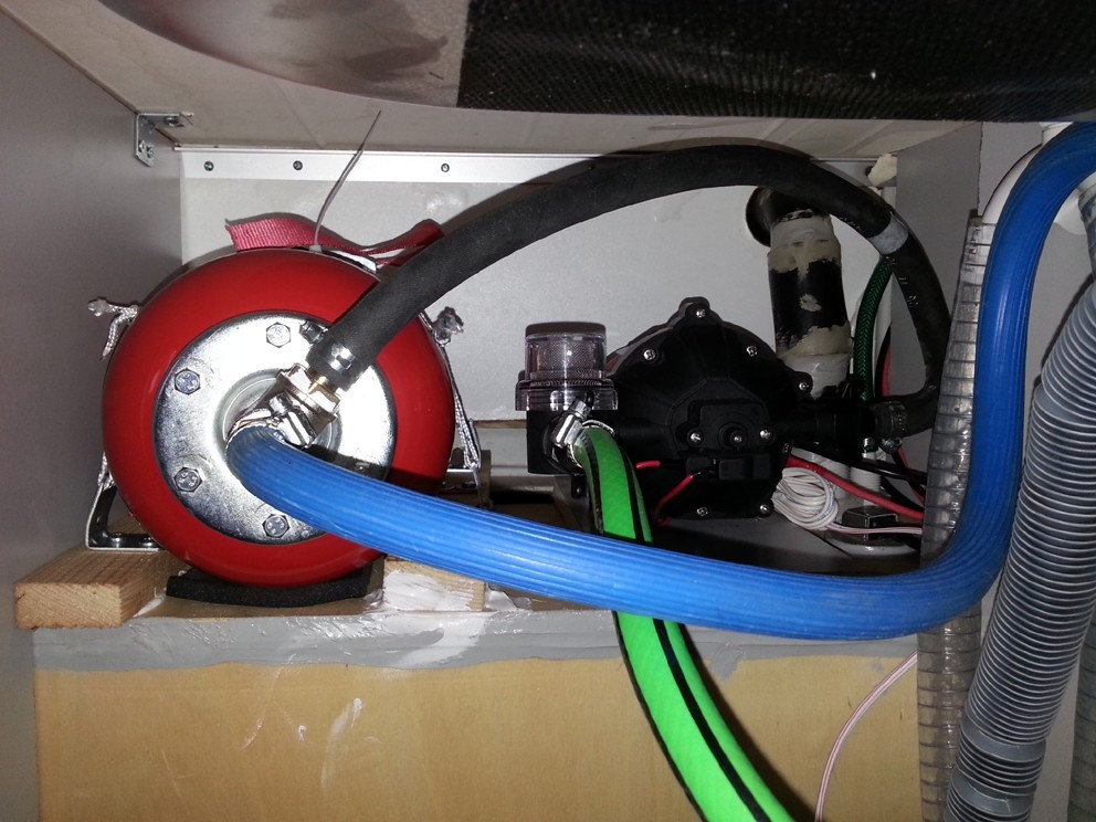 Hidrafor basınç tüpü, hidraforun çıkışına yakın bir yere araya "T" konularak bağlanıyor, hidrafor, sistemdeki borular ile birlikte basınç tüpününde içini komple 5 bar'a getiriyor...Bir çok arkadaşın hidraforlardan çikayeti, musluk kısık açıldığında hidrafordan çıkan sevimsiz seslerdir, bu doğaldır çünkü kısık açılımlarda hidrafor devreye girip girmeyeceği konusunda tereddüte düşüyor, garip sesler çıkarıyor, bu sırada suda dalgalı şekilde bir az bir çok akar...İşte basınç tüpü tüm bunlara engel oluyor, kısık musluk açılımında veya kısa süreli açılımlarda ilk ağız suyu basınç tüpünden geliyor, hidrafor ani olarak dervreye girmek zorunda kalmıyor, böylece, hidrafor rahatlıyor, bir nefes alıyor, sistemdeki su basıncı düşünce düzgün bir şekilde devreye girip çıkıyor, garip seslerde ortadan kalkıyor...Basınç tüpü aslında çok gerekli çünkü karavanların içindeki tesisat o kadar kısaki, tüm borulardaki su miktarı benim tahminim 2-3 tilre civarında oluyor, bu kadar az suyu sürekli 5 bar'da tutmak hidraforlar için zor iş, bu yüzden ani devreye giriş çıkışlardan ötürü zamanla vakumlarında sorunlar çıkmaya başlayıp, basınç otomatiklerinde arızalara sebebiyet veriyor...Hidrafor basın tüpü hidraforların sağlıklı çalışması ve çıkardıkları ses ile rahatsızlık vermelerine engel oluypr, hidraforun verim ve ömrünü artırıyor..Basın tüpünün 1-2-5-8-16-24 litrelik seçenekleri var, karavandaki yer imkanlarına göre ne kadar büyüğü takılırsa sisten o kadar düzgün ve sağlıklı çalıyor, ben 5 litrelik bir basınç tüpünün montajını yaptım...