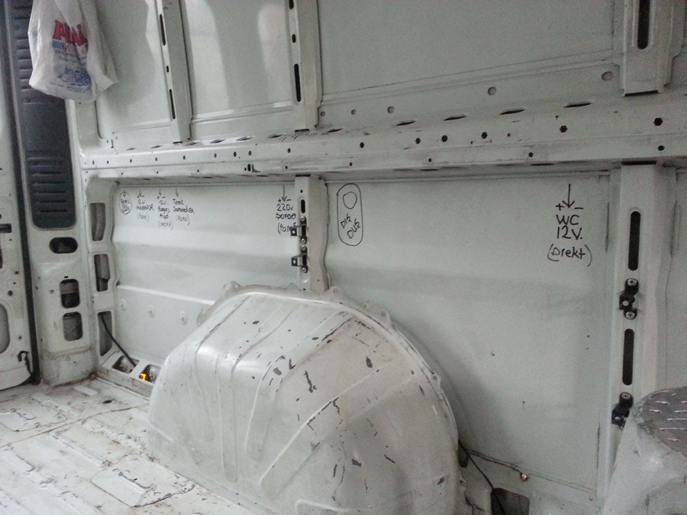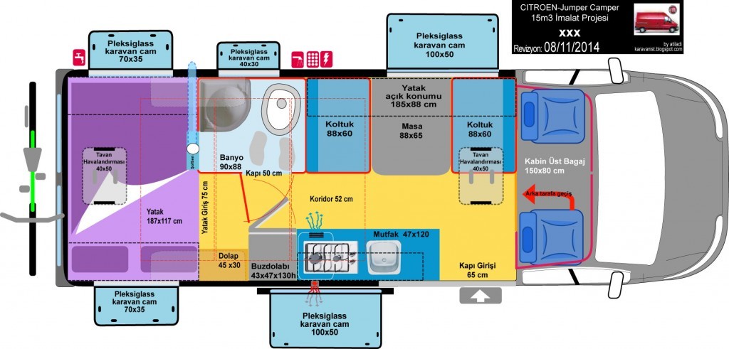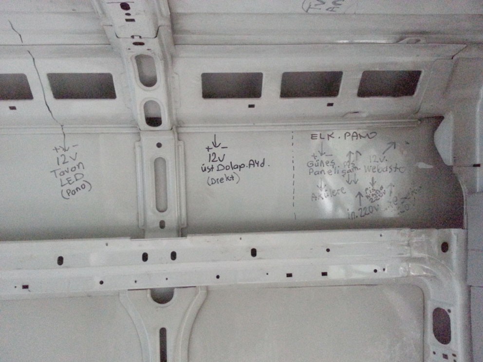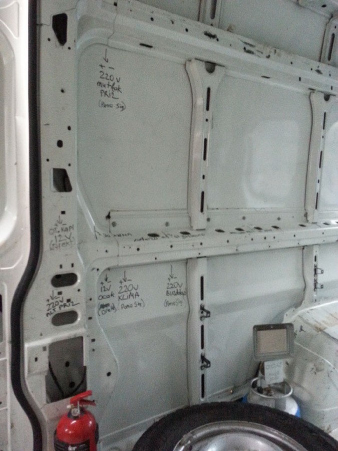 Koltuk işini halledimce, artık karavanın iç yerleşimini nasıl olacağına karar verip, elektrik, su tesisat işlerine geçmek gerekiyordu, iç planı kesinleştirdim, ve elektrik, su tesisatının giriş noktalarını belirledim, tün 12v ve 220v giriş ve kullanım noktalarını belirledim, araç iç yüzeyine hepsinin yerlerini kalem ile çizdim, bu notlar alınmaz ise bazı hatları çekmemiş olduğumuzu sonradan anlıyoruz, bazen bitmiş araca hat ilave etmek çok zor olabiliyor, her karavanda biz bile mutlaka bir tesisat hatası yaparız..12v ve 220v hatlar belirlenirken hangilerinin drek akü beslemeli, hangilerinin 12v sigorta panosundan geçeceği hangilerinin 220v otomatik sigortalardan geçeceği belirlenir, bazen bu tesisat planına uymak için extra yol katedecek kablolama yapılır...Bu çalışma sonunda karavanda kullanılacak, 4mm2'lik güneş paneli, hidrafor, akü şarz kablosundan kaç mt alınacağı, buzdolabı klima priz gibi yerlerde kullanılacak 220v tesisatta kullanılacak 2x2.5 kablo miktarı, led aydınlatmalarda kullanılacak 0.75 ne kadar kablo kullanılacağı satın alma için gerekli çalışmanın yapılması anlamına geliyor...Bu karavanda yaklaşık 80 mt 2x2.5, 100 mt 0.75, 30x2=60 mt 4mm2 kablo kullanılacağı bilgisi ortaya çıkmış oldu...