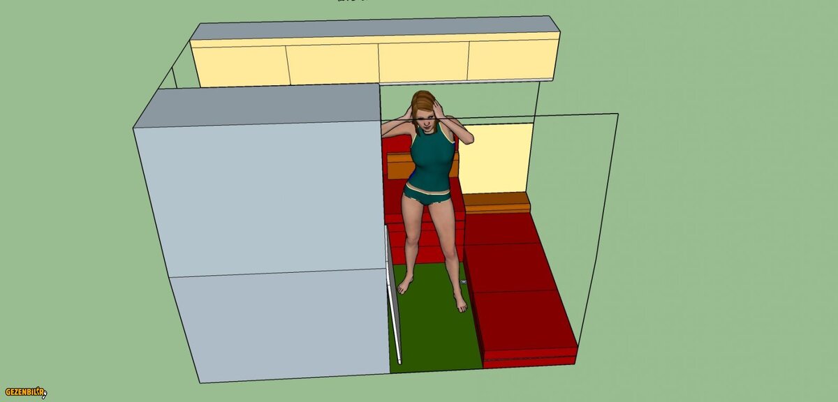 Teoman beyin dediği gibi yukarısı hariç belki başka pencere açılmaması düşünülebilir. Buzdolabı dolap içi gizlenmiş olabileceği gibi tek tek yatak olabilen sofa, ikinci resimde görüldüğü gibi izne kadar sadece sert süngerli minderlerden de yapılabilir ? Ankaste ocak yerine dışarıda kullanılmak üzere piknik tüpü ve suyu kapağı delinmiş plastik şişeden alan, üzeri ayni tezgah tahtasıyla kapatılmış lavabo çözümü de planı zorlamamalı ?