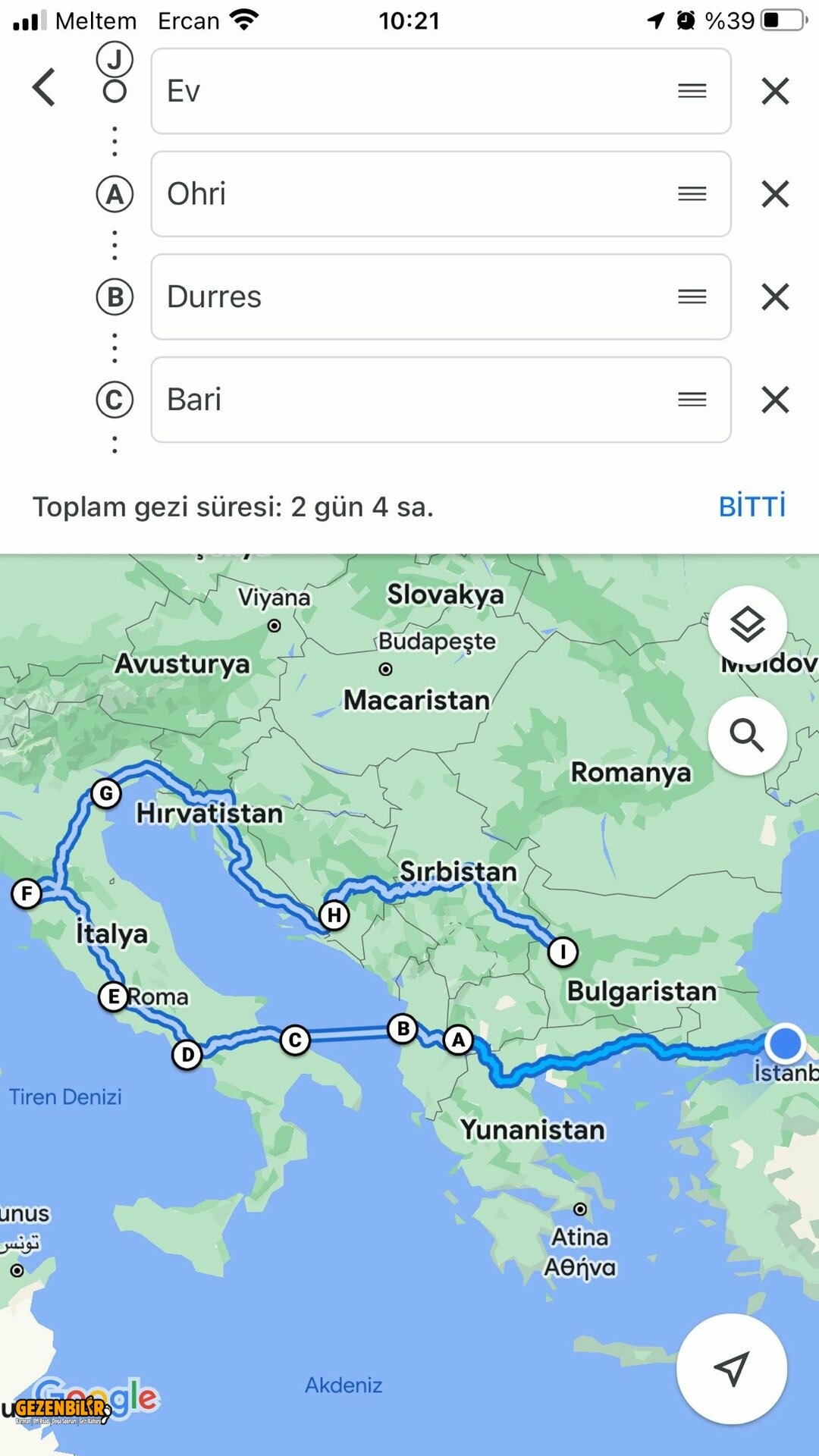Planlama resimdeki gibi düşünüyorum 8 gece konaklama yapacağım Airbnb üzerinden 7 gece bir gecesi de feribotta (Durres