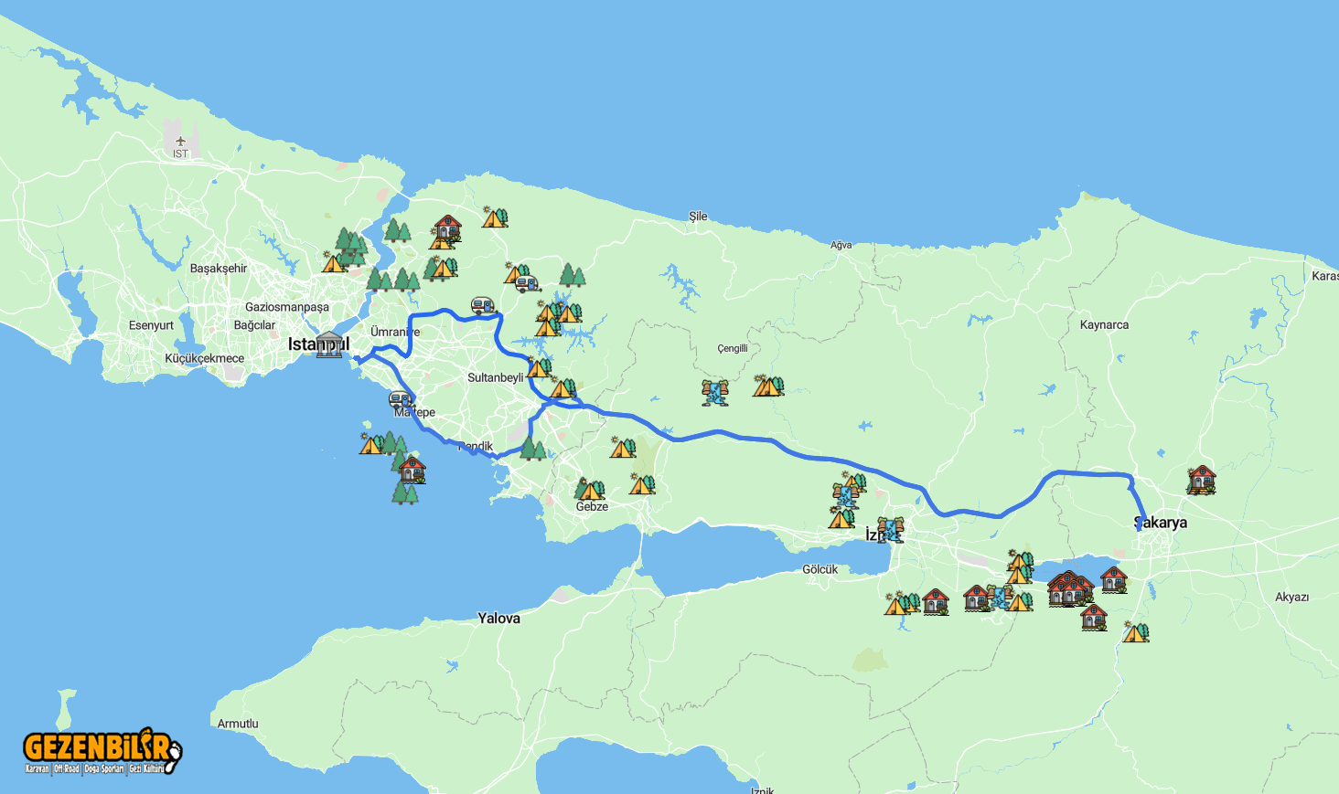 Başlangıç ve Bitiş rotanızdaki kamp alanları, karavan parkları, milli parklar, şelaler vs tüm alanları görebileceğiniz bir uygulama.