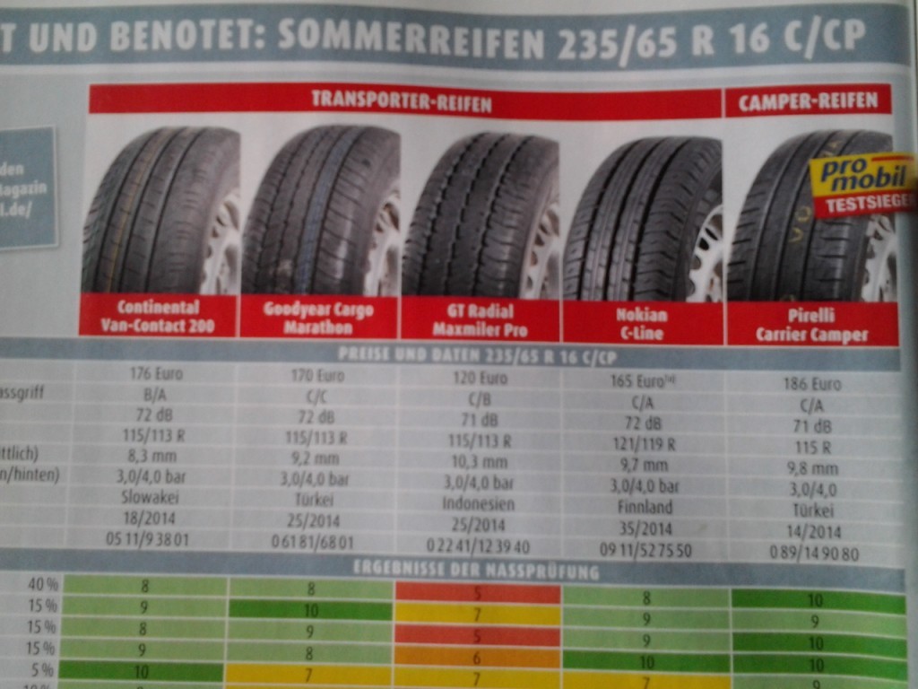 Almanyanın en büyük iki karavan dergisinden biri olan Promobil'in yaptırdığı karavanlar için yaz lastikleri testine göre, Türkiye'de üretilen Pirelli Carrier Camper kalite, dolayısıyla tavsiye olarak bütün lastiklerin en önünde yer alıyor !