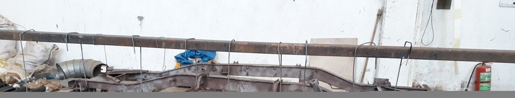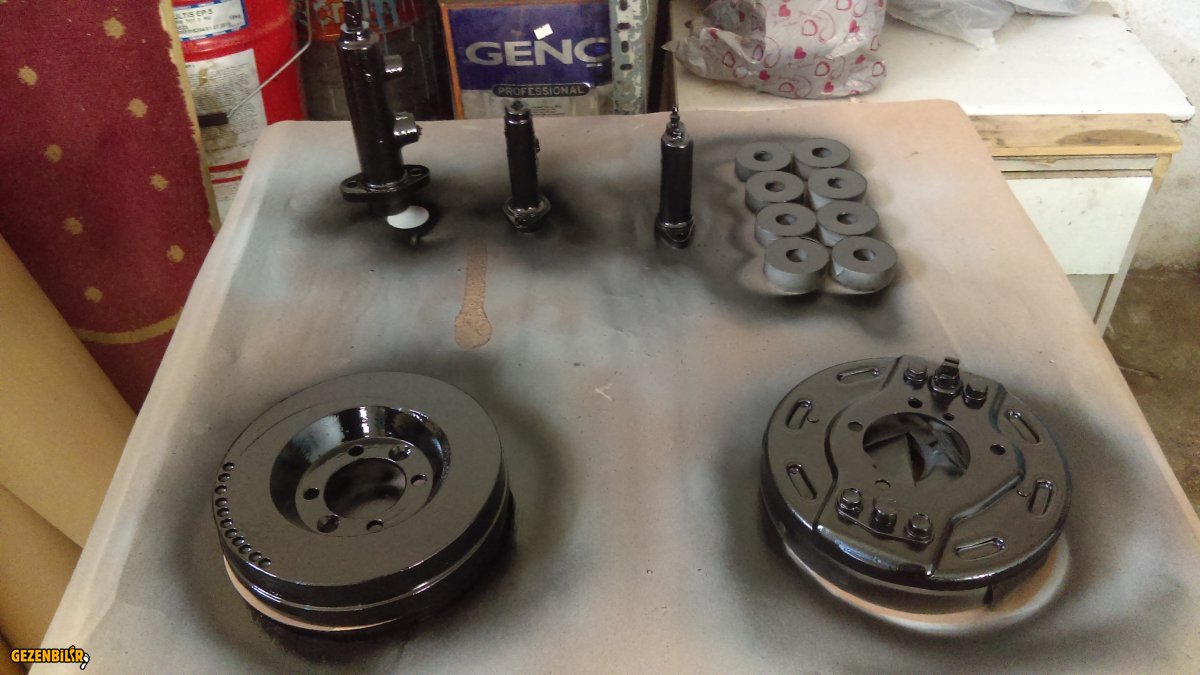 Tabi parça sayısı çok yerimiz de dar olunca bu işi bir kaç partide yapabileceğiz. Bu hafta süspansiyon sisteminin bağlantı parçalarını temizledik. Makas küpeleri, pullar , askılar, somunlar, amortisör bağlantı parçaları vs. Tüm bu paslı parçaların hepsini tek tek elde tel fırça ile temizledik, daha sonra astar öncesi tüm parçaları tinerli bezle silerek üzerindeki kalan yağlardan arındırdık ve astarlanmak üzere tek tek astık. Epoksi astar ile bir kat boyadık 1-2 gün sonra 2. kat astar uyguladık ve 2 gün kurumaya bıraktık. Üzerine 2 kat akrilik mat siyah boya ile boyadık.