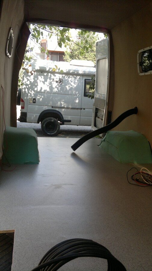 Daha sonra tavan ve duvar döşeme, ilk yaptığım aracın düzgün resmi olmadığı için bu konuyla ilgili olarak 2. aracın resimlerini ekliyorum. Duvardan çıkan siyah boru ise Truma combinin egzos borusu. Aynı zamanda zeminde mineflo kaplanmış durumda görünüyor.