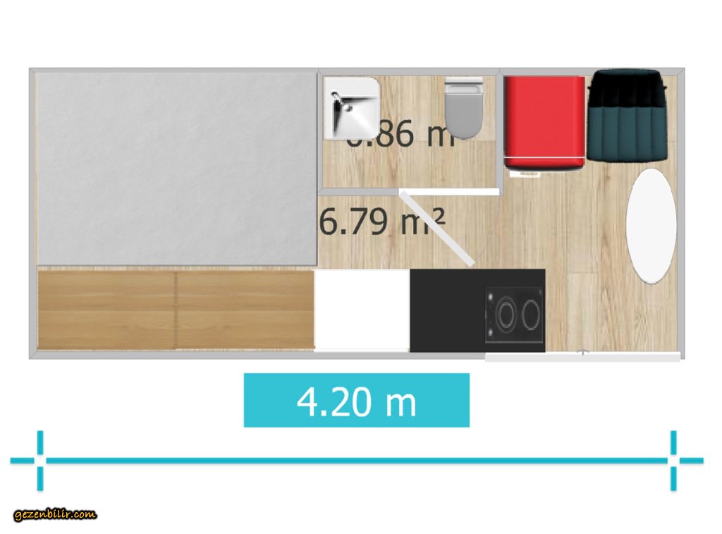 Karşısında 120x80 cm WC duş lavabo sonra altta bulaşık makinesi üzerinde buzdolabı ve bir tekli koltuk. Önünde de açılır kapanır oval masa.