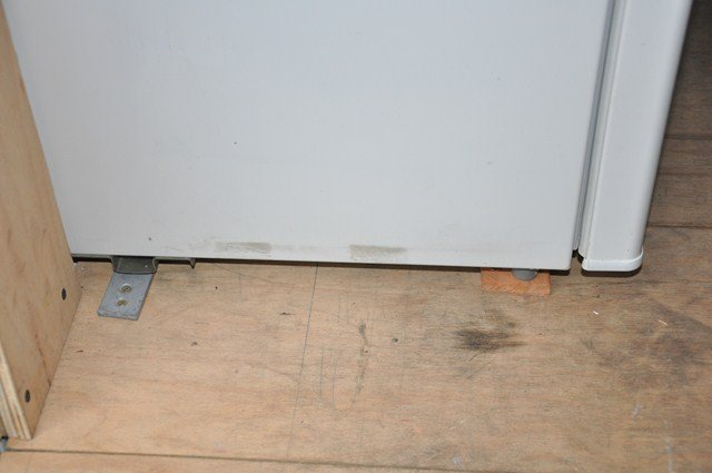 Tatil dönüşünü, okul başlamazdan evvel biraz ısınma turları atıp buzdolabının araç içinde gezinmemesi için altına bir parça metal vidaladım. Bunu da yere vidaladım. Arka tarafı yükselince, ön tarafı da biraz yükseltmek gerekti.