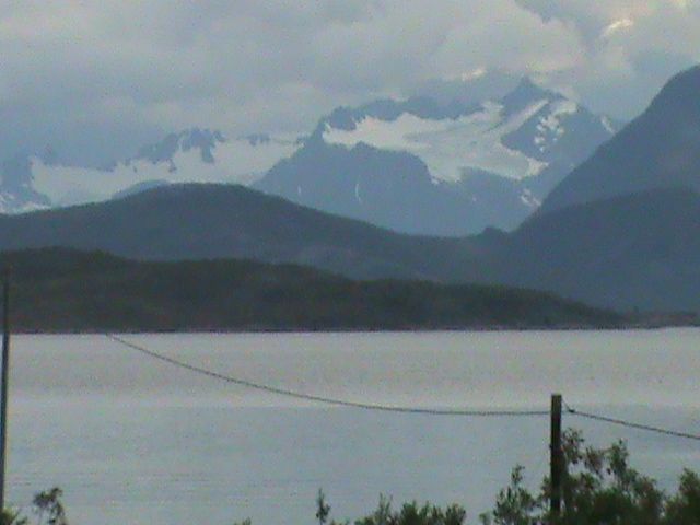 Rotsundet adındaki daracık boğazdayız. Karşımızdaki Uloya adası. Adanın üzeri tamamen bulutlarla örtülü. Arkasındaki Iddonjargga yarımadasındaki 1390 ve 1398 metrelik dağlardaki buzulları izliyoruz.