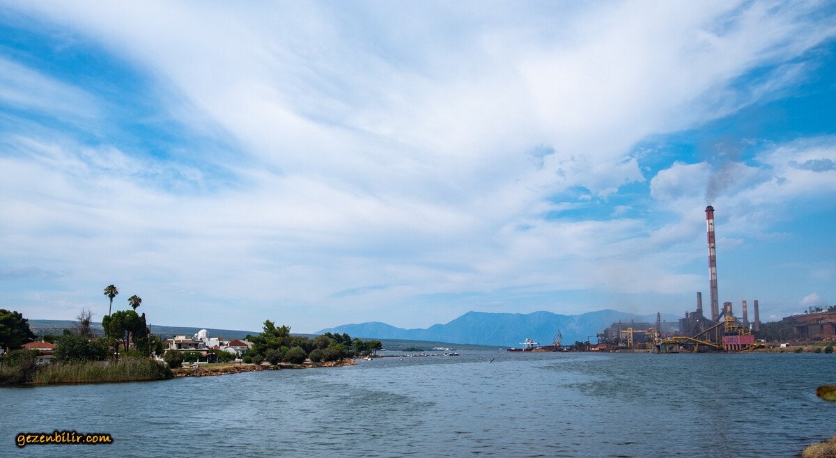 Yol kenarında çam ağaçlarının altında, denize 7 - 8 metre dik bir yamacın üzerinde yer bulup kahvaltımızı yapıyoruz. Bu akşam konaklanacak yeri, yine doğaçlama “Larymna” olarak belirledik. Dar, bazen toprak yollardan, dağ, tepe aşarak akşam 5 gibi varıyoruz Larymna’ya. Burası ufak bir koy, koyun karşı kıyısında haritada gözümüzden kaçan Metallica kasabası var. Aslında kasaba değil Larco firmasının demir, çelik fabrikası. Burası dahil, koyun çevresi demir pası renginde. Dev baca ve çıkan duman da hiç hoş değil. Bir kaç fotoğraf çekip hemen kaçıyoruz.