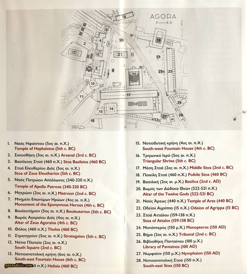 Saat 15:00’ i geçtiği için Hadrian Kütüphanesi kapalı. O zaman hedef Ancient Agora, yürüyerek varıyoruz. Kombine biletlerimiz burada da geçerli. Kombine bilet ile beş gün içerisinde her yere girebiliyorsunuz ama birer kere girme şansınız var. Gerçekten çok yorulduk, yoksa burayı yarım bırakıp yarın devam ederdik. Girdik bir kere bitireceğiz mecburen. Büyük bir alan (Broşürden görebilirsiniz) Hemen hemen her yerini dolaşıyoruz ama biz de bitiyoruz, 22,000 adım atmışız bu sıcakta şu ana kadar. Söyleniyor ama Ada’nın bizimle bu kadar yürümesine şaşırıyorum. Alışıyor sanırım.
