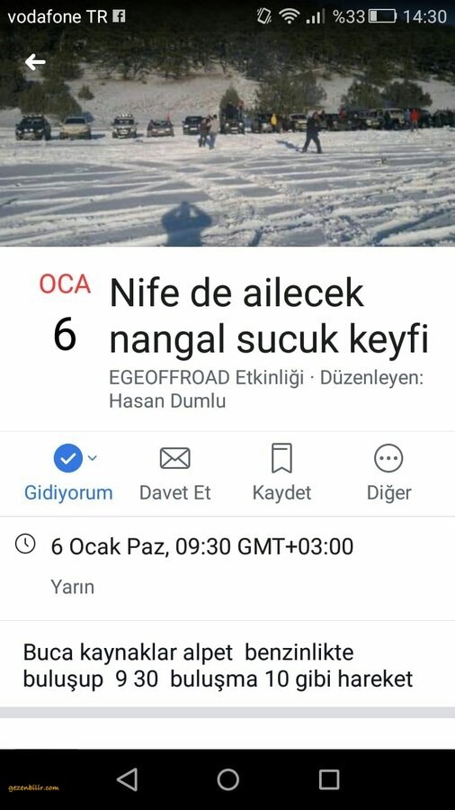 " Bu hafta sonu yapacak olduğumuz Nif dağı gezimiz ve piknik etkinliğini Smyrna Doğa Sporları ve Offroad Kulübü Grubu. İzmir Off-raad grubu.egeoffroad gurubu ve lada Niva Türkiye grubu.Üyelerinin dikkatine buluşma yeri Buca kaynaklar mezarlığını geçince soldaki benzinlikte sabah saat 09.00 da hareket 09.30 da herkes kendi yiyeceğini kendi getirecek şeklide yapıyoruz katılım ailece olacak. Gelecek arkadaşlar araçlarına birer çuval kuru odun alırsa iyi olur.Kesinlikle patlayıcı , silah ve benzeri şeyler yasaktır. İrtibat 05425252563 Ercan Çalışkan "