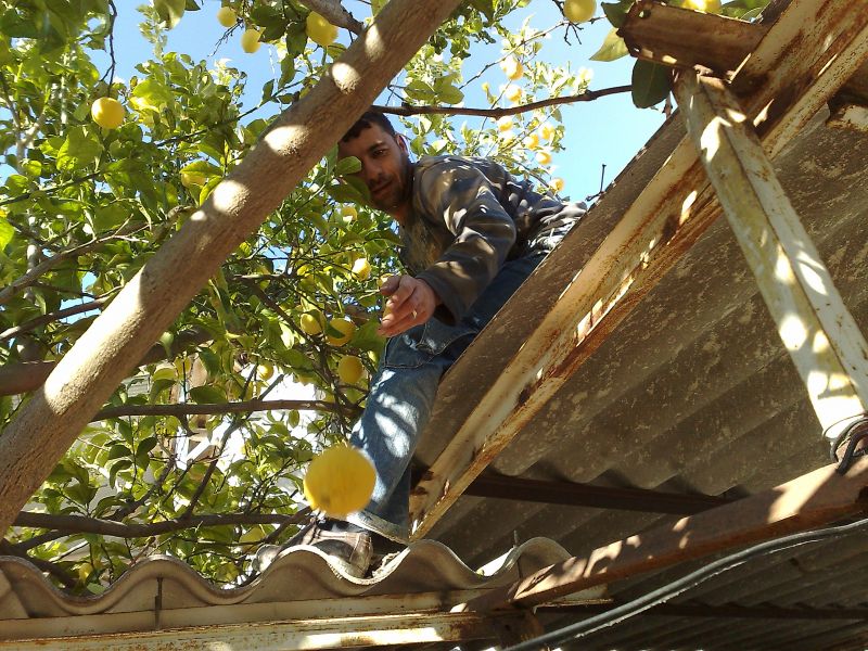 Ama Oda nee !!! Ahmet ağaca çıkmış hemde limon ağacına tutuğu limonu koparıyor ve aşağıya sallıyor bende kopan limonları havada uçuş pozlarını yakalamaya çalışıyorum.