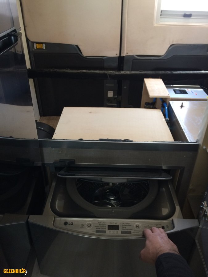 Karantina günlerinde tıbbi malzeme üretimi sektöründe yer aldığımız için eksilerek çalışmamızı sürdürmek zorundaydık. Bende bu günleri fabrika önünde karavanımızla uğraşarak geçiriyorum. Üç kızı olan beş kişilik bir aile olduğumuz için öncelikli ihtiyacımız çamaşırdı ve bize özellikle büyük dert oluyordu. Eşim çocukların giysileri konusunda hassaslığı dolayısıyla fazla giysi almasına rağmen avrupa turumuz esnasında çamaşır yıkama işlerine oldukça para yatırmıştım nerdeyse 2-3 güne bir bazen iki kez çamaşır mutlaka yıkatmıştık kampın makinalarına (her işleme yerine göre 5-10 euro arası ödeme yaptığım için unutmadım). Bu aralar karavancılar arasında oldukça konuşulan LG marka çamaşır makinasından bende aldım ve iki gündür uğraşarak sonunda montajını bügün bitirdim. Başlamışken çocukların istedikleri zaman rahatça su içebilmeleri için birde internetten aldığım şarjlı su pompası taktım. Su pompasını yolculuk esnasında sorun çıkarmaması için tezgahın altına yaptığım bölmeye koyduğum 5 litrelik tek kullanımlık bidonlar ile besleyeceğim. Çamaşır makinası için su depomuzdan biraz feragat etmek zorunda kaldım. 200 litre olan depoyu makinaya yer açmak için 135 litreye düşürdüm. Makinanın ne kadar su harcadığı konusunda kesin bilgi sahibi değilim ama bir videoda izlediğim kadarıyla 50 litre kadar harcıyormuş. Artık kullanmak nasip olursa bakacağız bu sezonda suyla ilgili problem yaşayacakmıyız. sonuçta yaparken biz kamp dışı konaklama pek yapmıyoruz diye olumlu düşünerek başladım işe. Elektrik konusunda sıkıntı yaşayacağımı sanmıyorum ama onuda göreceğiz bakalım. Bu arada sormak istediğim bir konu var, en son montajı bitirince hidroforu bağladım ve elektriği verince hidroforun hortumunu tam takamamışım ve su olanca gücüyle(2.5 bar) bir fiskiye gibi heryere ulaştı aküler ve invertör dahil. Panikle hemen düğmeye basıp kapattım ama alarma düşmüştü bile. kapalı olduğu halde alarm veriyor. Bende akünün bağlantı kablosunu çıkardım dünden beri duruyor, kabloyu sökmeden önce resim çekmiştim buraya atıyorum bilgisi olan fikir verirse sevinirim.