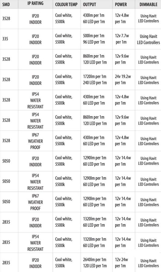 Üreticiler metrede kullandığı led sayısına ve cip türüne göre sarfiyatları değişmekle birlikte örenk bir tablo aşağıdadı.