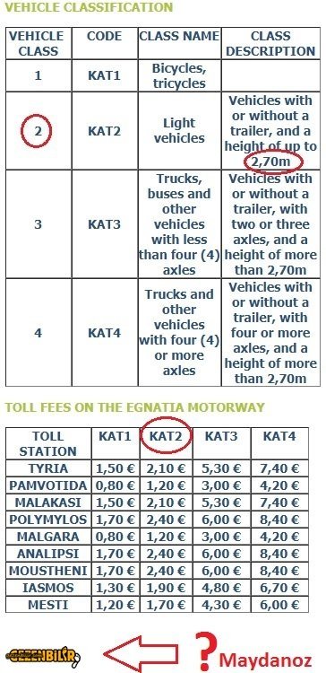 Sayın ince999 yüksekliği 220cm daha fazla olan araçlar iki katı ücret ödüyor yazmışınız ancak Yunanistan otobanında 270cm yükseklikten sonra ücret iki katına yakın artıyor diye biliyordum yanlışım varsa düzeltin lütfen.
